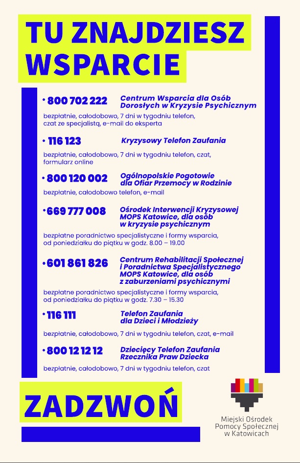 bezpłatne poradnictwo specjalistyczne i formy wsparcia, od poniedziałku do piątku w godz, 8.00-19.00 - 601 861 826 Centrum Rehabilitacji Społecznej i Poradnictwa Specjalistycznego MOPS Katowice, dla osób z zaburzeniami psychicznymi